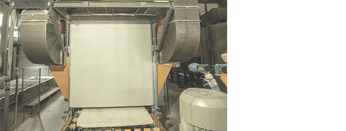 Robotic machinery reverse and shifts the slab to the cleaning machine. Grinding machine is used with water jets to remove resin drops and dust particles for a smooth surface. Slabs are then heated in heating chambers for dying.